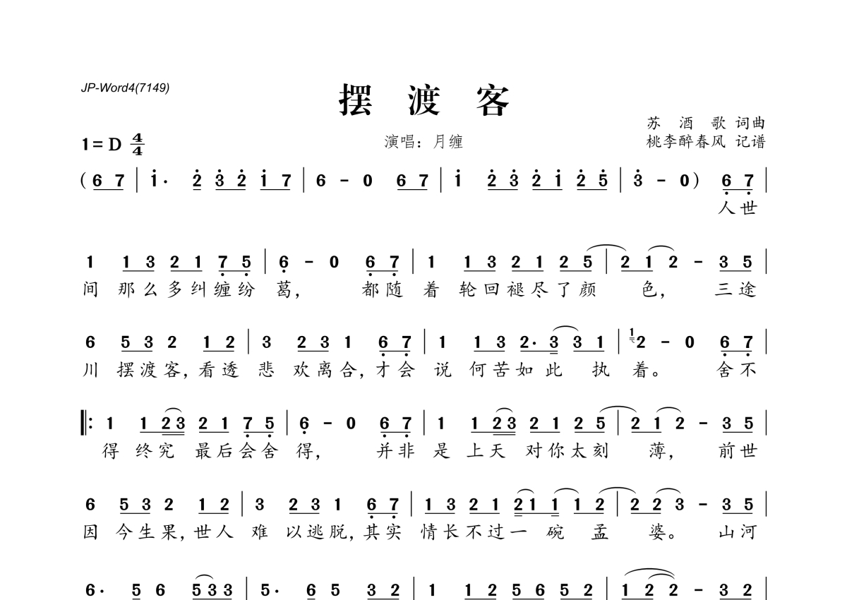 《摆渡客》是月缠演唱的一首歌曲,拍号为4/4拍,这份简谱共有一张高清图谱,图谱由 @桃李醉春风 编配上传。