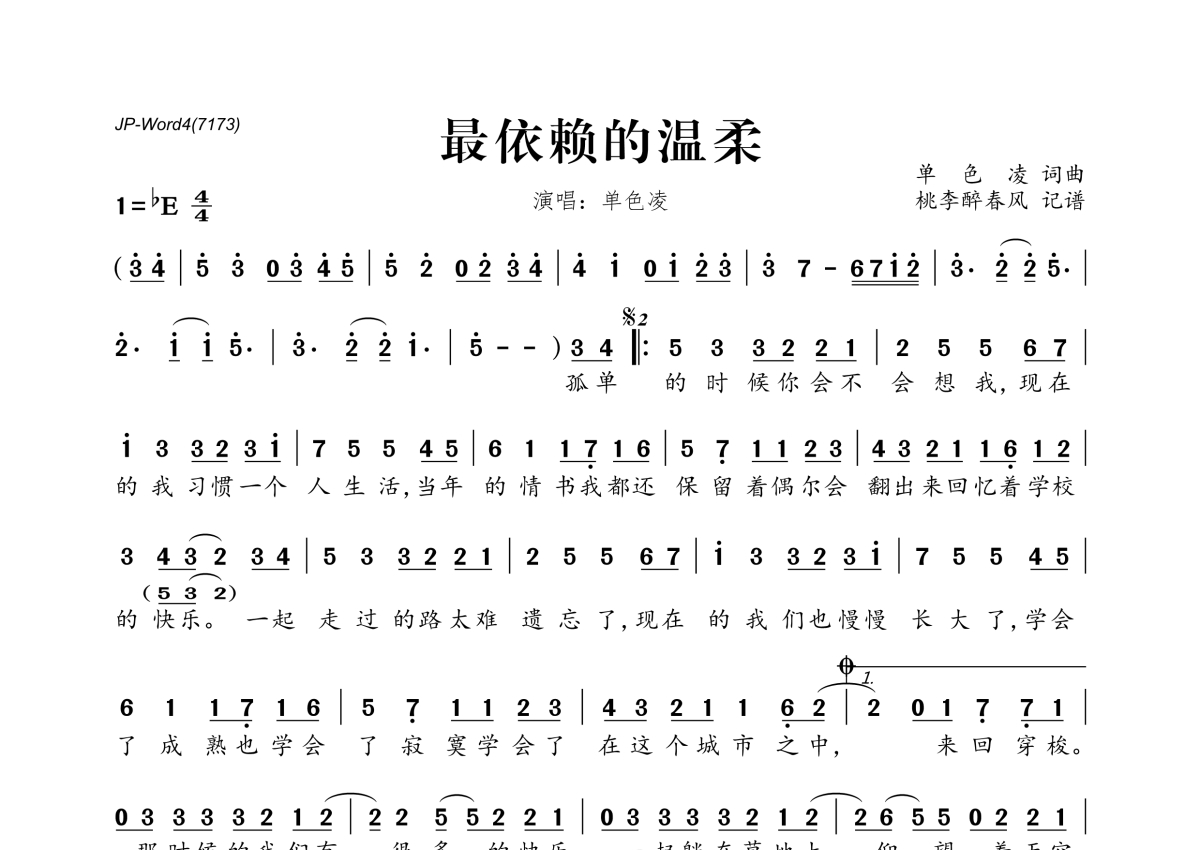 《最依赖的温柔》是单色凌演唱的一首歌曲,拍号为4/4拍,这份简谱共有一张高清图谱,图谱由 @桃李醉春风 编配上传。