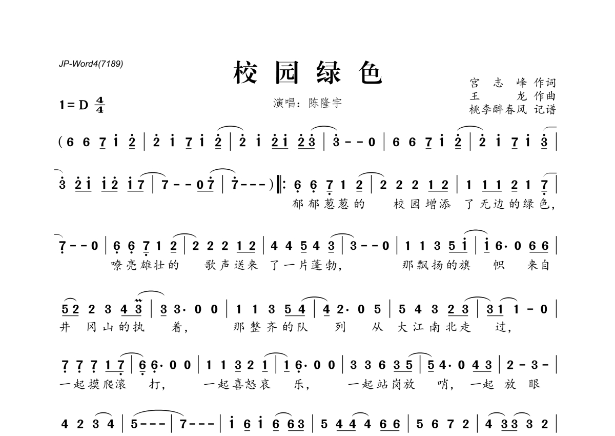 《校园绿色》是陈隆宇演唱的一首歌曲,拍号为4/4拍,这份简谱共有一张高清图谱,图谱由 @桃李醉春风 编配上传。