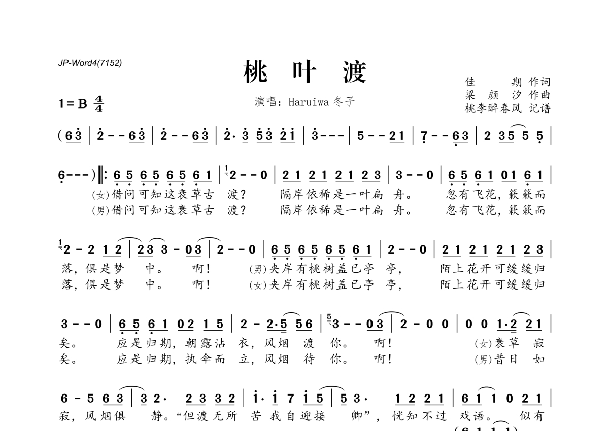 《桃叶渡》是Haruiwa&冬子演唱的一首歌曲,拍号为4/4拍,这份简谱共有两张高清图谱,图谱由 @桃李醉春风 编配上传。