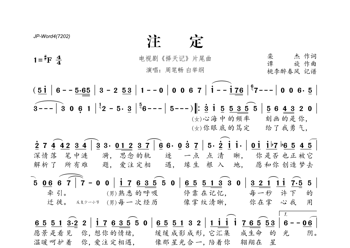 《注定》是周笔畅&白举纲演唱的一首歌曲,拍号为4/4拍,这份简谱共有一张高清图谱,图谱由 @桃李醉春风 编配上传。