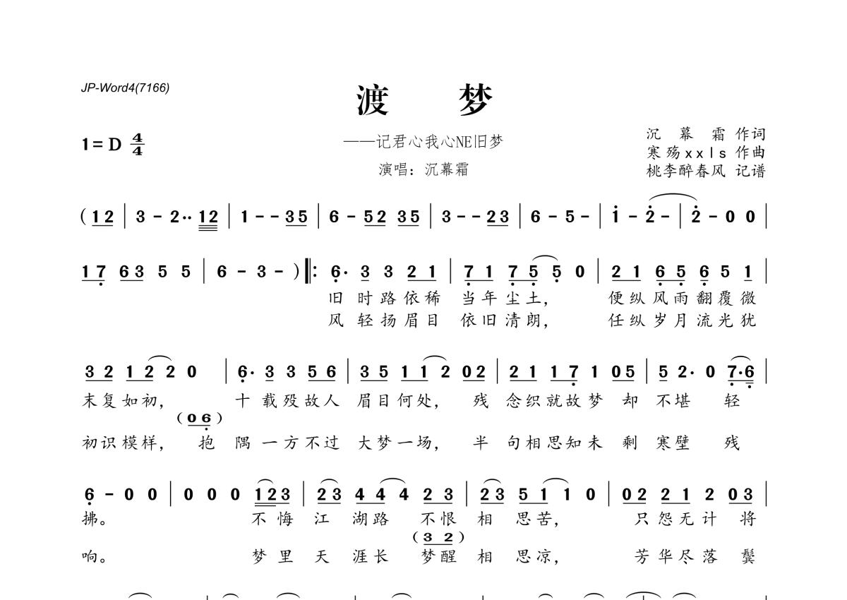 《渡梦》是沉幕霜演唱的一首歌曲,拍号为4/4拍,这份简谱共有一张高清图谱,图谱由 @桃李醉春风 编配上传。