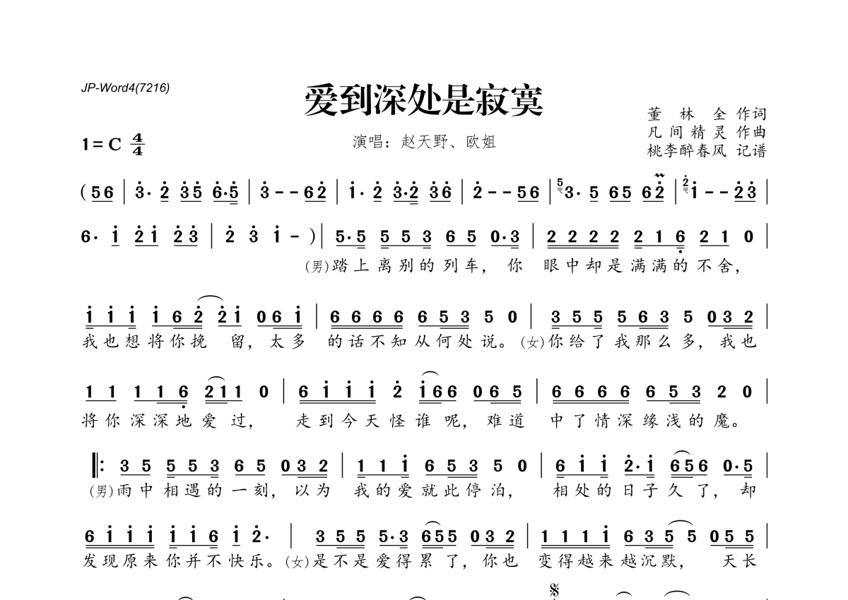 《爱到深处是寂寞》是欧姐&赵天野演唱的一首歌曲,拍号为4/4拍,这份简谱共有一张高清图谱,图谱由 @桃李醉春风 编配上传。