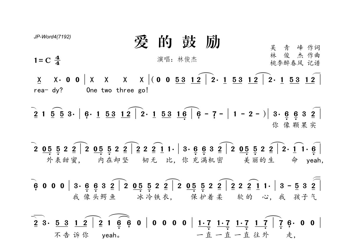 《爱的鼓励》是林俊杰演唱的一首歌曲,拍号为4/4拍,这份简谱共有两张高清图谱,图谱由 @桃李醉春风 编配上传。