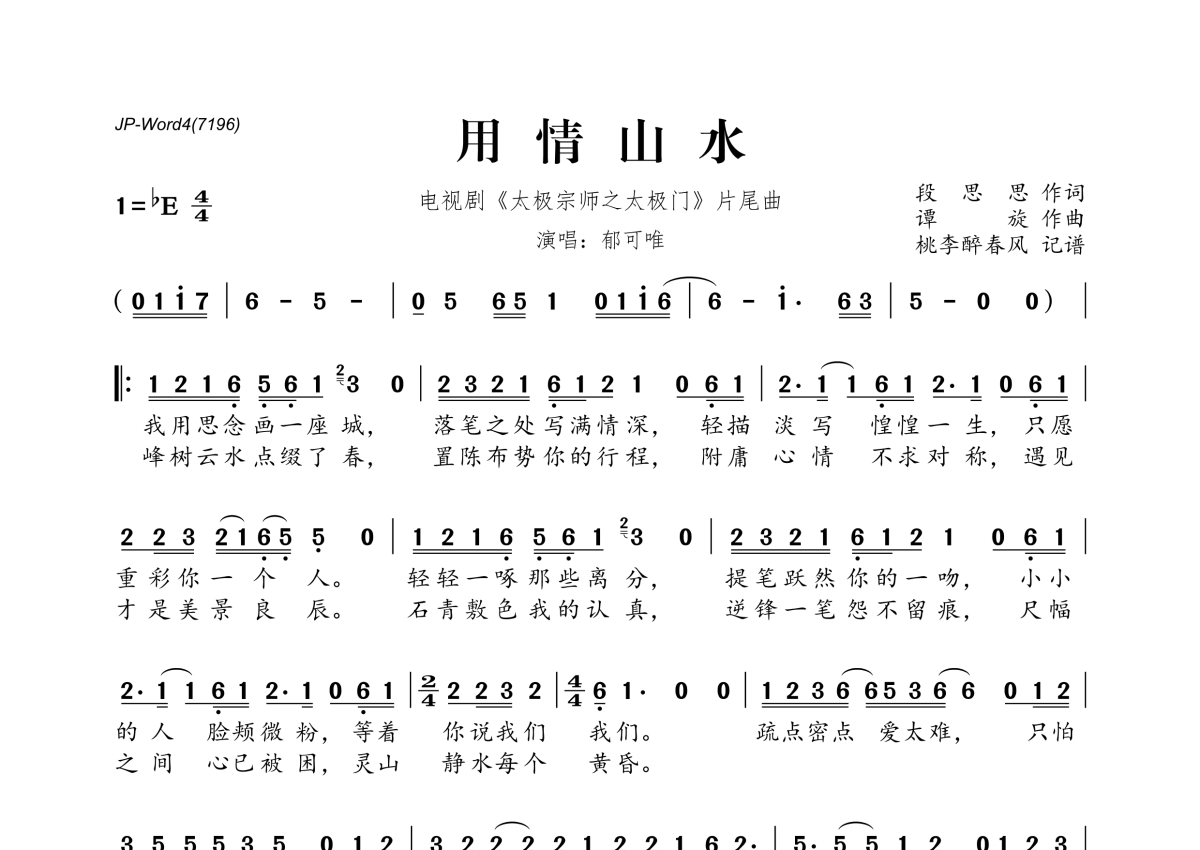 《用情山水》是郁可唯演唱的一首歌曲,拍号为4/4拍,这份简谱共有两张高清图谱,图谱由 @桃李醉春风 编配上传。