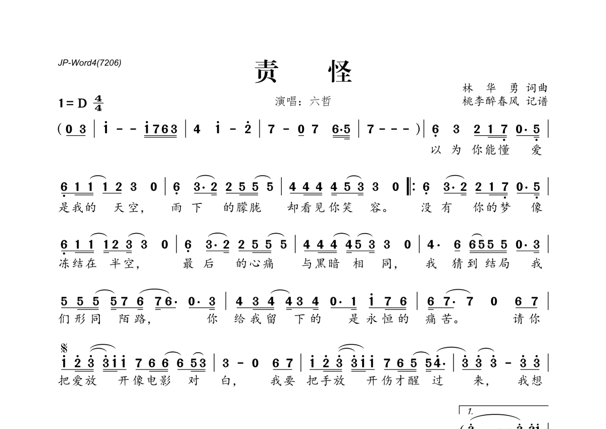 《责怪》是六哲演唱的一首歌曲,拍号为4/4拍,这份简谱共有一张高清图谱,图谱由 @桃李醉春风 编配上传。