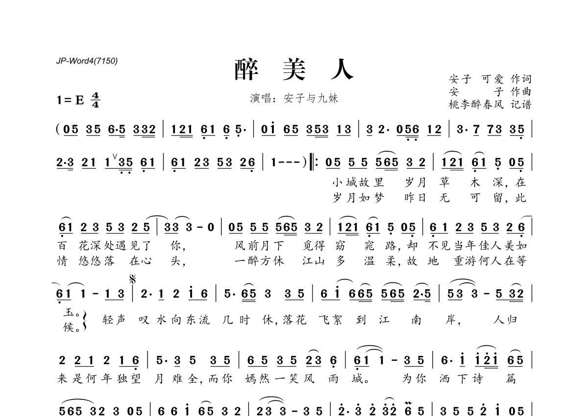 《醉美人》是安子与九妹乐队演唱的一首歌曲,拍号为4/4拍,这份简谱共有一张高清图谱,图谱由 @桃李醉春风 编配上传。