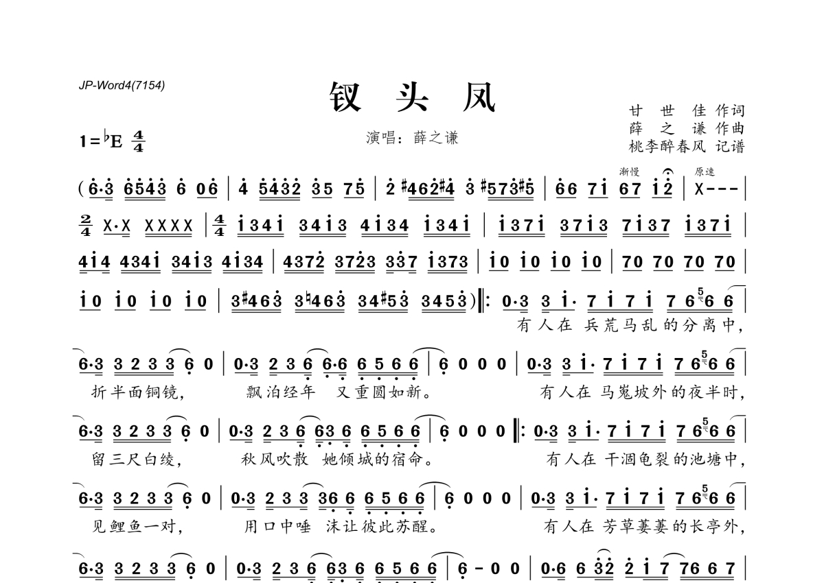 《钗头凤》是薛之谦演唱的一首歌曲,拍号为4/4拍,这份简谱共有一张高清图谱,图谱由 @桃李醉春风 编配上传。