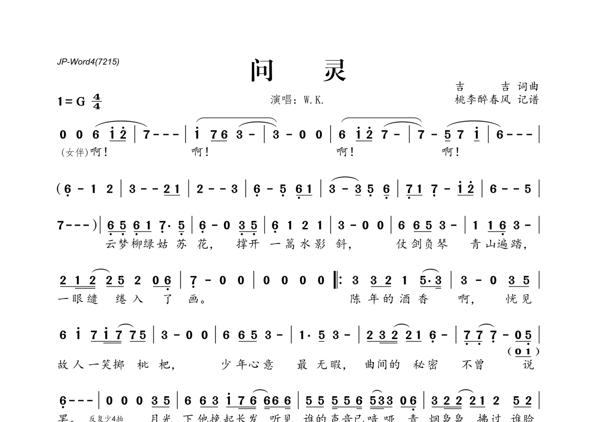 《问灵》是W.K.演唱的一首歌曲,拍号为4/4拍,这份简谱共有一张高清图谱,图谱由 @桃李醉春风 编配上传。