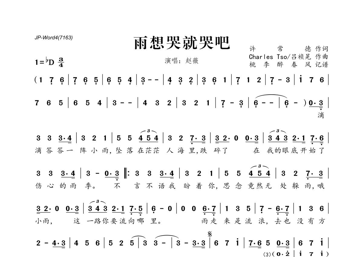 《雨想哭就哭吧》是赵薇演唱的一首歌曲,拍号为3/4拍,这份简谱共有一张高清图谱,图谱由 @桃李醉春风 编配上传。