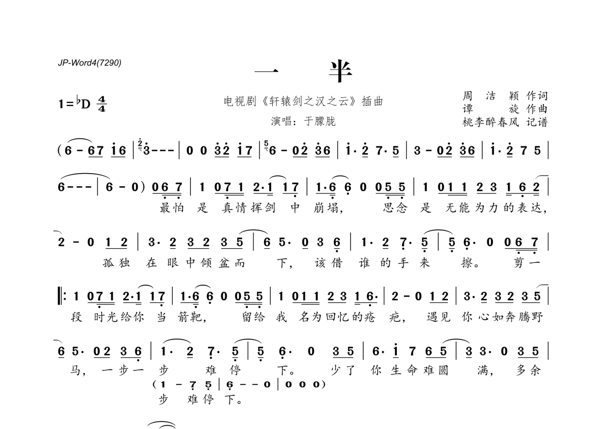 《一半》是于朦胧演唱的一首歌曲,拍号为4/4拍,这份简谱共有一张高清图谱,图谱由 @桃李醉春风 编配上传。