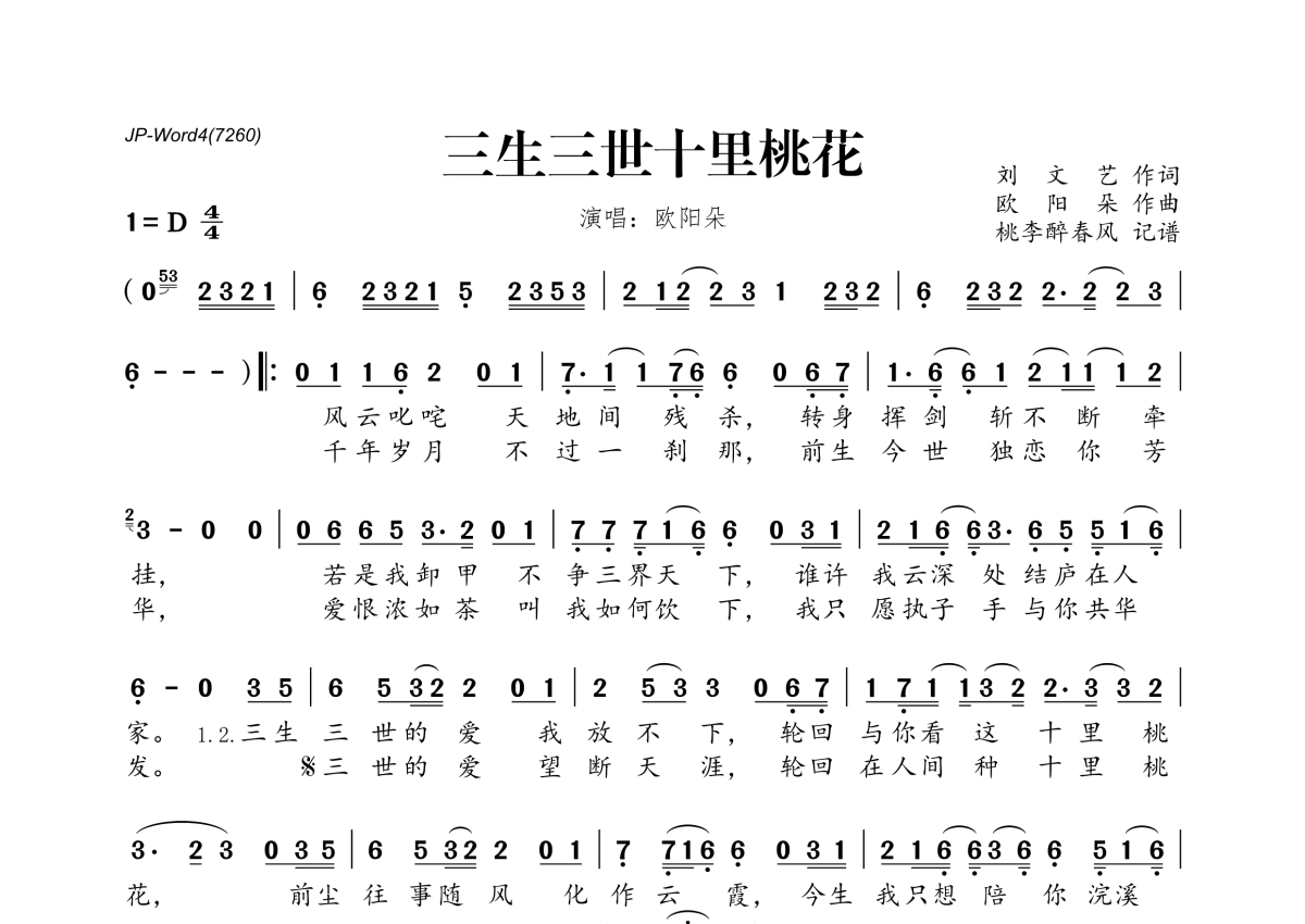 《三生三世十里桃花》是欧阳朵演唱的一首歌曲,拍号为4/4拍,这份简谱共有一张高清图谱,图谱由 @桃李醉春风 编配上传。