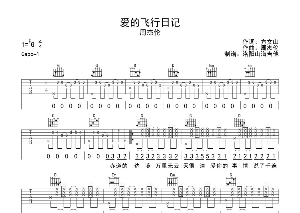 周杰伦《爱的飞行日记》吉他谱 - G调弹唱六线谱