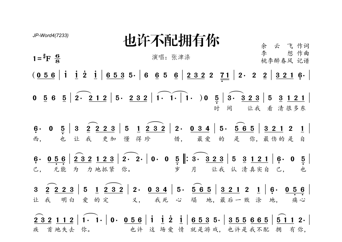 《也许不配拥有你》是张津涤演唱的一首歌曲,拍号为6/8拍,这份简谱共有一张高清图谱,图谱由 @桃李醉春风 编配上传。