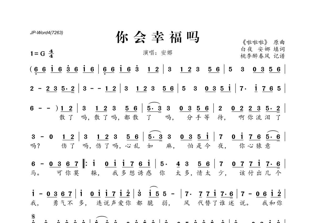 《你会幸福吗》是安娜(小娜)演唱的一首歌曲,拍号为4/4拍,这份简谱共有一张高清图谱,图谱由 @桃李醉春风 编配上传。