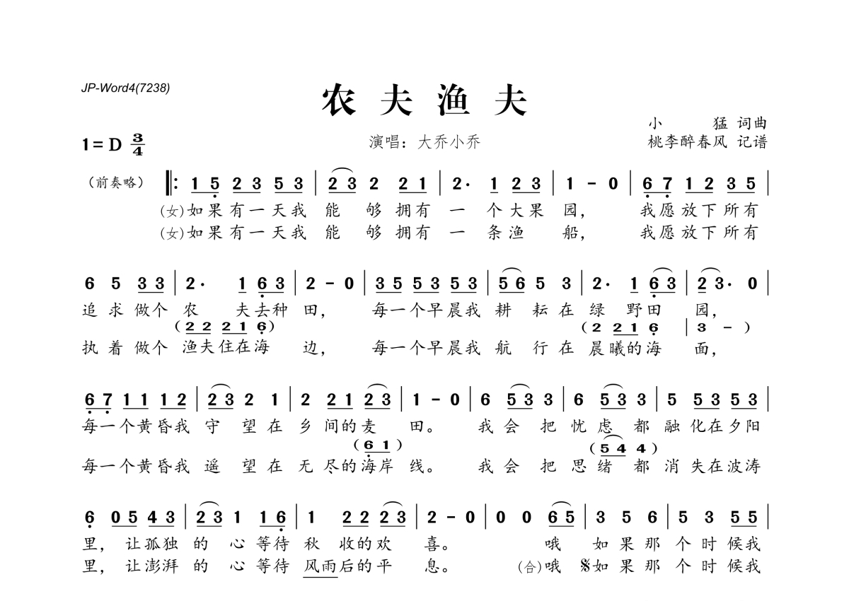 《农夫渔夫》是大乔小乔演唱的一首歌曲,拍号为3/4拍,这份简谱共有一张高清图谱,图谱由 @桃李醉春风 编配上传。