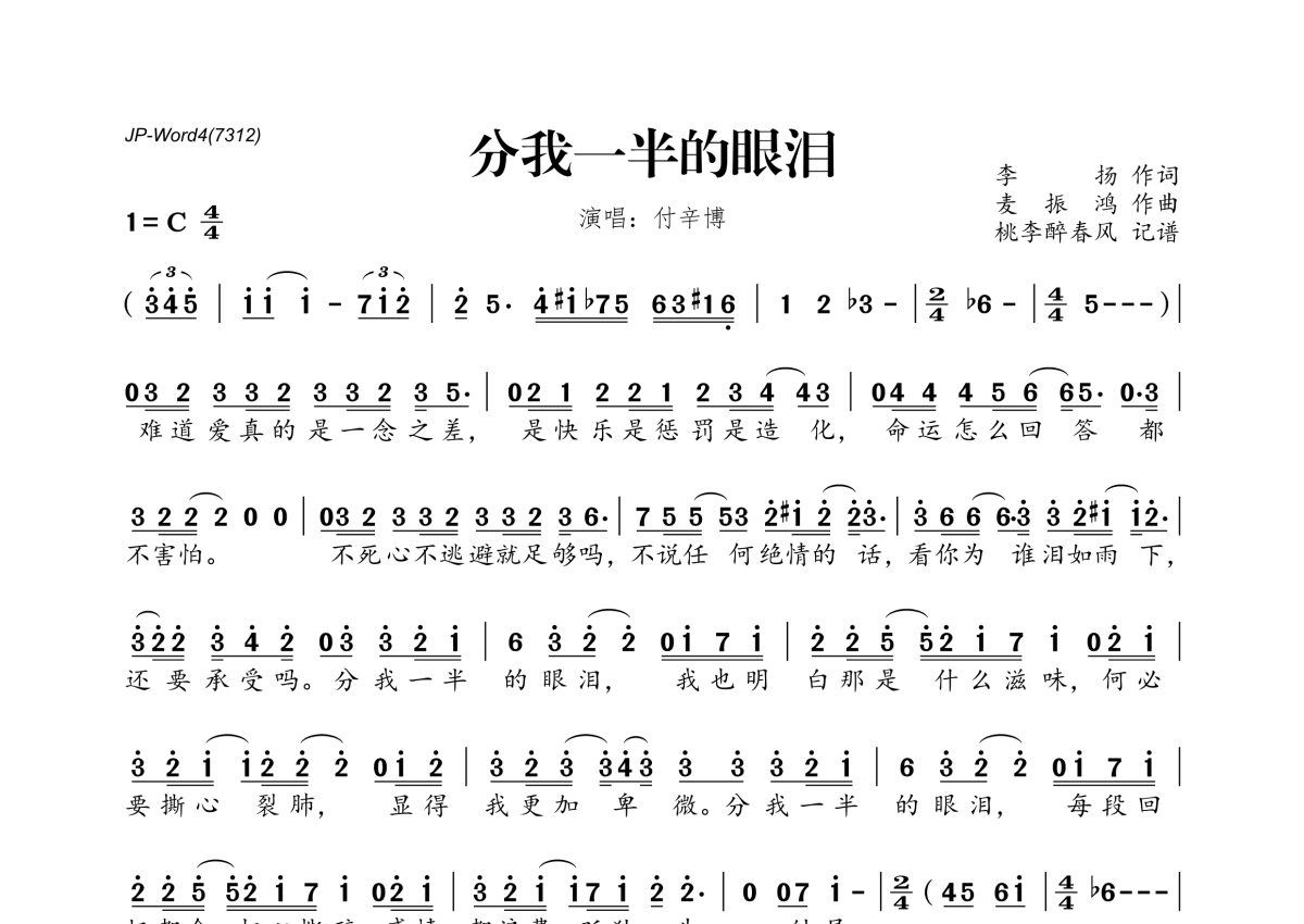 《分我一半的眼泪》是付辛博演唱的一首歌曲,拍号为4/4拍,这份简谱共有一张高清图谱,图谱由 @桃李醉春风 编配上传。