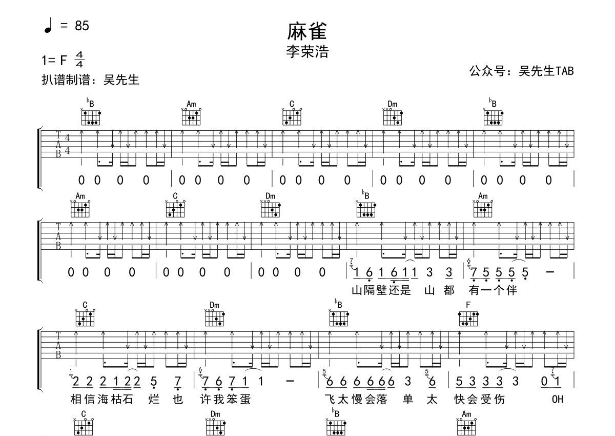 《麻雀》是李荣浩演唱的一首歌曲,本吉他谱采用的是F调指法编配,这份吉他谱共有两张高清图谱,图谱由 @吴先生TAB 编配上传,图谱使用六线谱编配,包含吉他和弦指法、简谱以及歌词部分,使用这份麻雀吉他谱,可以让你更加方便地掌握这首歌曲的弹唱技巧,快来尝试吧。李荣浩的一首新歌,用麻雀映射都市人间的平凡生活。李荣浩的新歌词曲俱佳,少了很多刻骨铭心的悲伤,多了几分随性洒脱的释然。麻雀也有明天,道出每一个平凡人对未来的美好期望,唯有梦想才能让我们逆流而上。