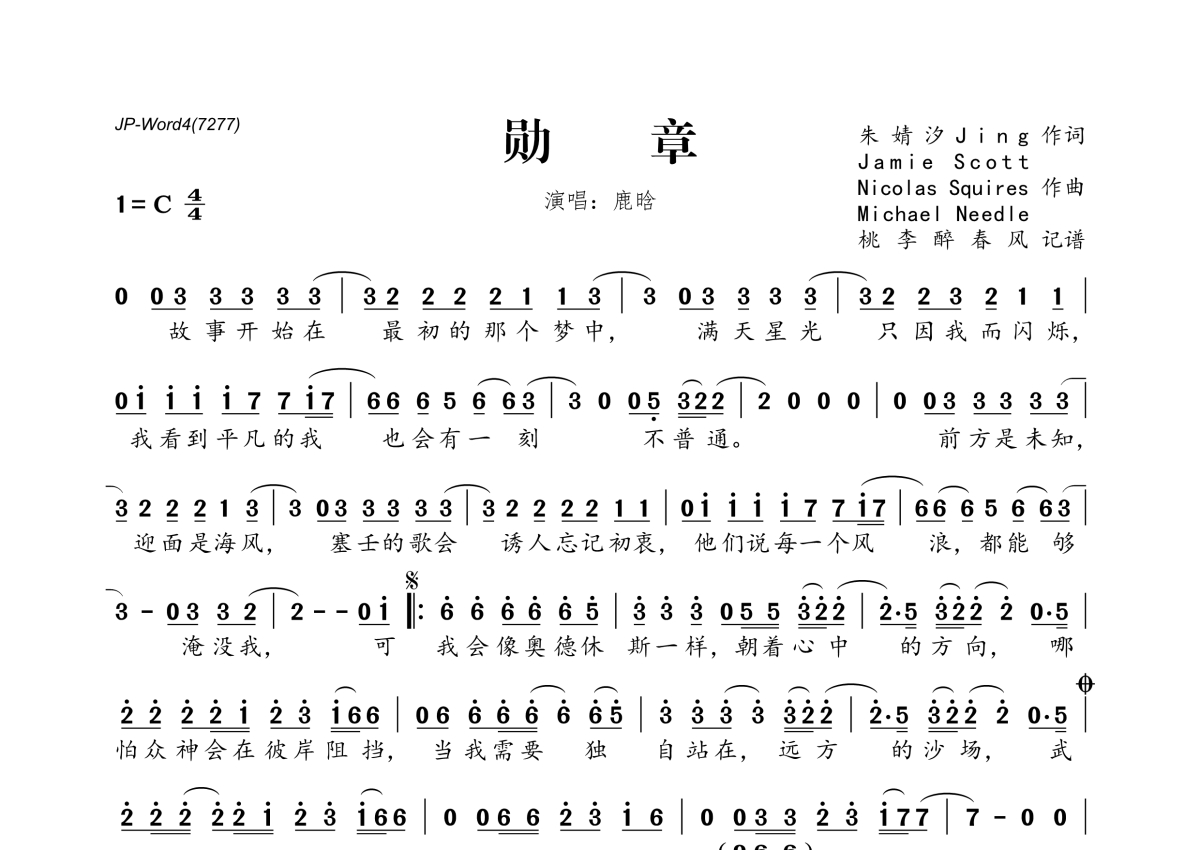 《勋章》是鹿晗演唱的一首歌曲,拍号为4/4拍,这份简谱共有一张高清图谱,图谱由 @桃李醉春风 编配上传。
