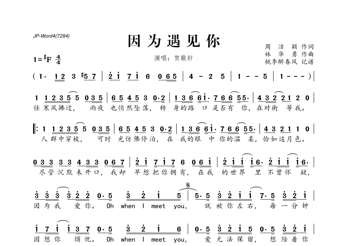 《因为遇见你》是贺敬轩演唱的一首歌曲,拍号为4/4拍,这份简谱共有一张高清图谱,图谱由 @桃李醉春风 编配上传。