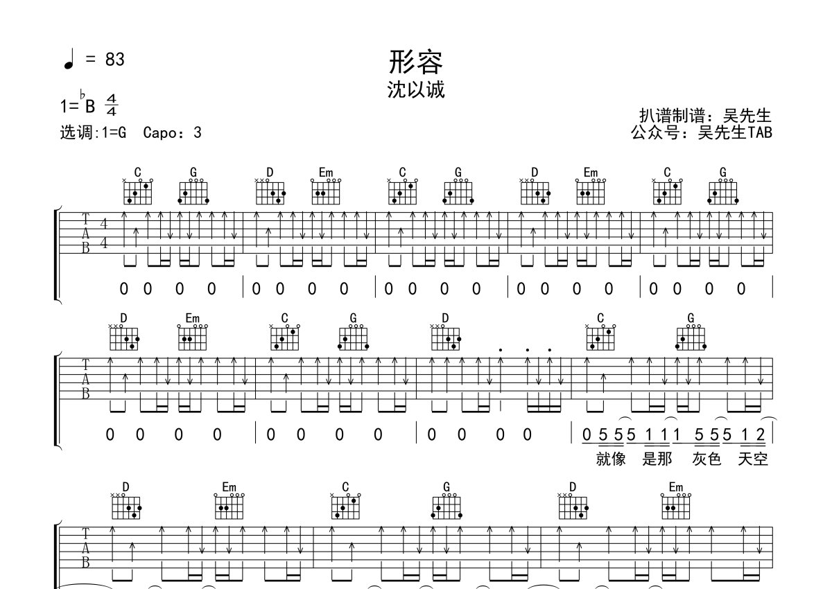 《形容》是沈以诚演唱的一首歌曲,本吉他谱采用的是G调指法编配,这份吉他谱共有三张高清图谱,图谱由 @吴先生TAB 编配上传,图谱使用六线谱编配,包含吉他和弦指法、简谱以及歌词部分,使用这份形容吉他谱,可以让你更加方便地掌握这首歌曲的弹唱技巧,快来尝试吧。原调bB,选用G,变调夹夹三品。我想遍了漂亮的句子来形容你,但都不及万一,也说不出对你有爱你,只知道喜欢你的程度,是所有喜爱的事物加起来都无法企及。那么,就弹唱一首热烈而温暖的情歌,送给你。
