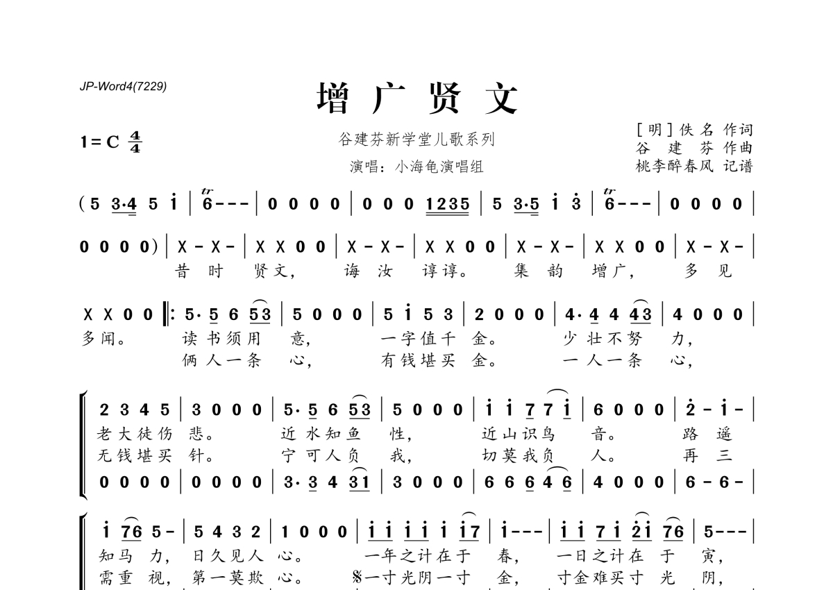 《增广贤文》是小海龟演唱组演唱的一首歌曲,拍号为4/4拍,这份简谱共有一张高清图谱,图谱由 @桃李醉春风 编配上传。