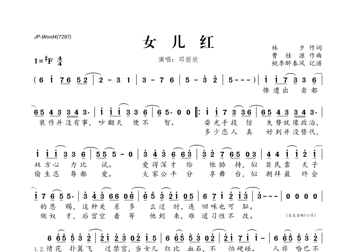 《女儿红》是邓丽欣演唱的一首歌曲,拍号为4/4拍,这份简谱共有一张高清图谱,图谱由 @桃李醉春风 编配上传。
