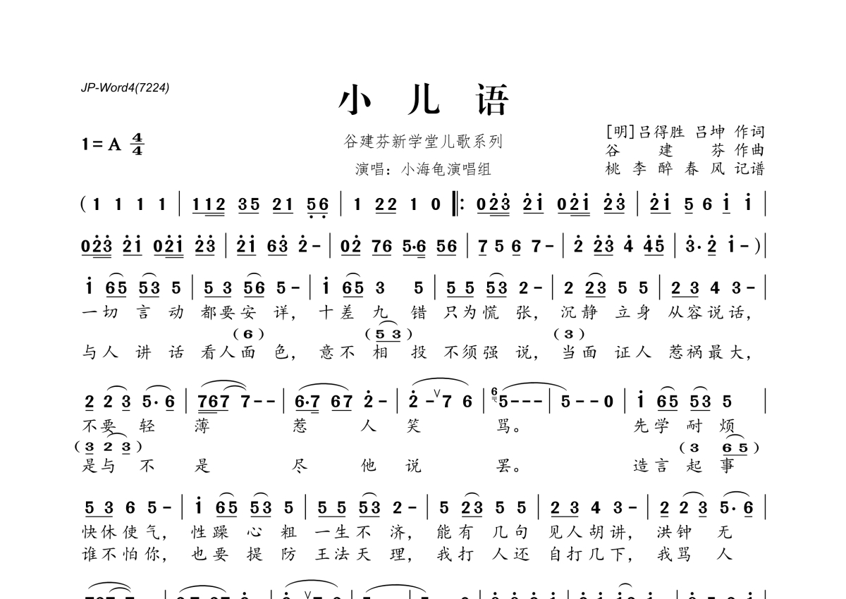 《小儿语》是小海龟演唱组演唱的一首歌曲,拍号为4/4拍,这份简谱共有一张高清图谱,图谱由 @桃李醉春风 编配上传。