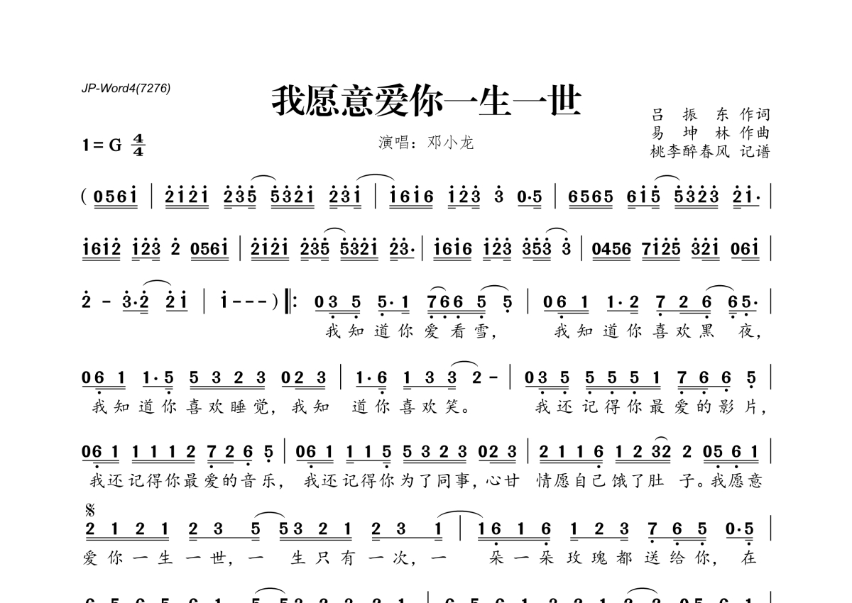 《我愿意爱你一生一世》是邓小龙演唱的一首歌曲,拍号为4/4拍,这份简谱共有一张高清图谱,图谱由 @桃李醉春风 编配上传。