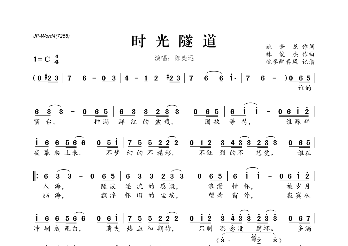 《时光隧道》是陈奕迅演唱的一首歌曲,拍号为4/4拍,这份简谱共有两张高清图谱,图谱由 @桃李醉春风 编配上传。