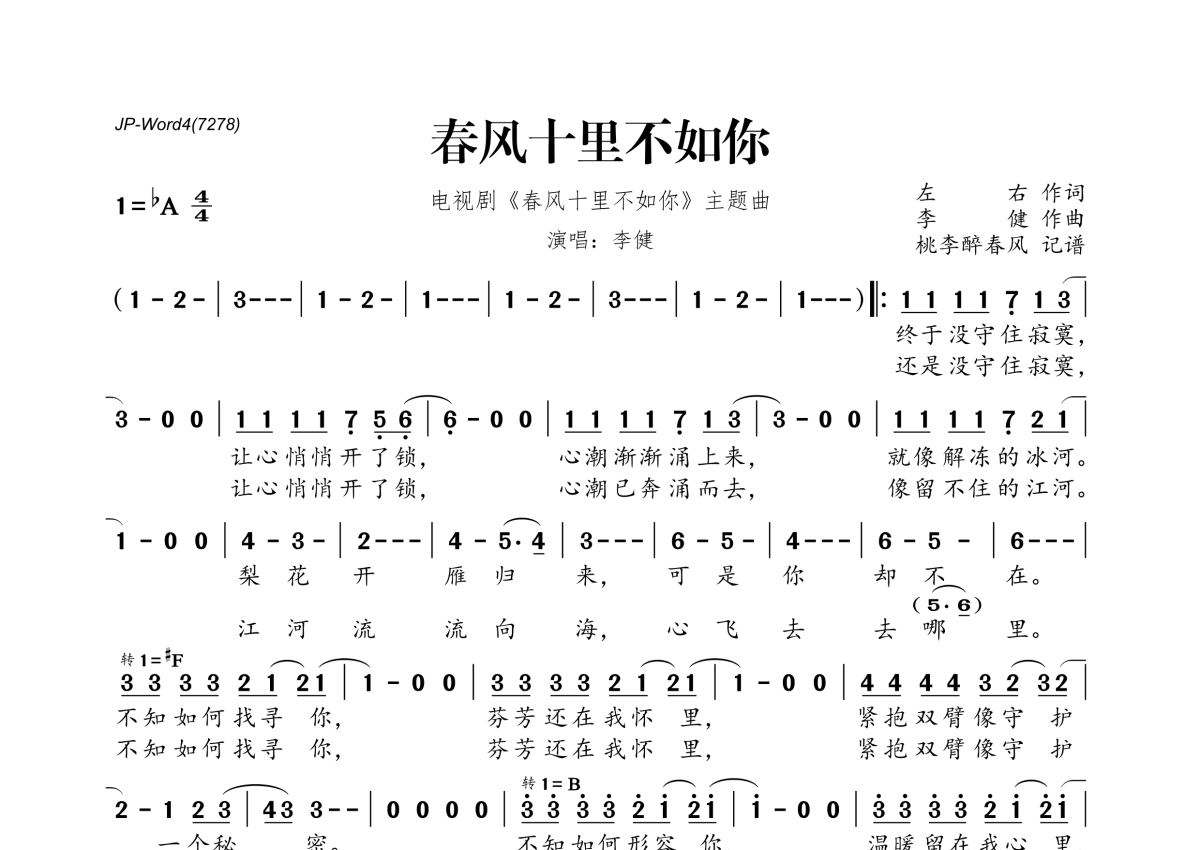《春风十里不如你》是李健演唱的一首歌曲,拍号为4/4拍,这份简谱共有一张高清图谱,图谱由 @桃李醉春风 编配上传。