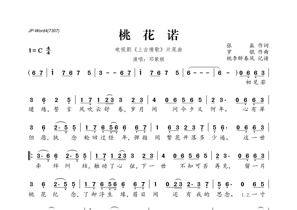 《桃花诺》是G.E.M.邓紫棋演唱的一首歌曲,拍号为4/4拍,这份简谱共有一张高清图谱,图谱由 @桃李醉春风 编配上传。