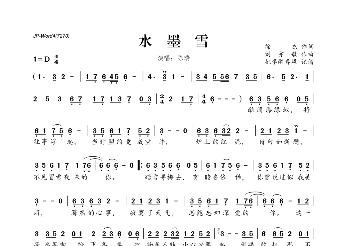 《水墨雪》是陈瑞演唱的一首歌曲,拍号为4/4拍,这份简谱共有一张高清图谱,图谱由 @桃李醉春风 编配上传。