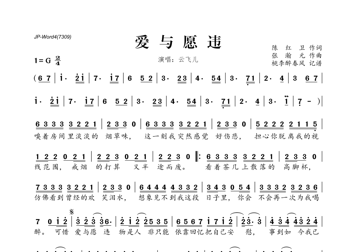 《爱与愿违》是云飞儿演唱的一首歌曲,拍号为2/4拍,这份简谱共有一张高清图谱,图谱由 @桃李醉春风 编配上传。