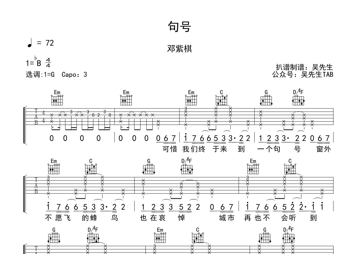 《句号》是邓紫棋演唱的一首歌曲,本吉他谱采用的是G调指法编配,这份吉他谱共有三张高清图谱,图谱由 @吴先生TAB 编配上传,图谱使用六线谱编配,包含吉他和弦指法、简谱以及歌词部分,使用这份句号吉他谱,可以让你更加方便地掌握这首歌曲的弹唱技巧,快来尝试吧。《句号》吉他谱,邓紫棋演唱的这首新歌,鼓励所有需要拿出勇气的人。句号六线谱,原调降B,选调G,CAPO夹三品,一首《句号》,结束也是新生,邓紫棋从新上路。愿这个世界的人都能做到哪怕经历多少苦和泪,都能最后如这首《句号》一样,将事情画上句号,温柔以待这个世界。