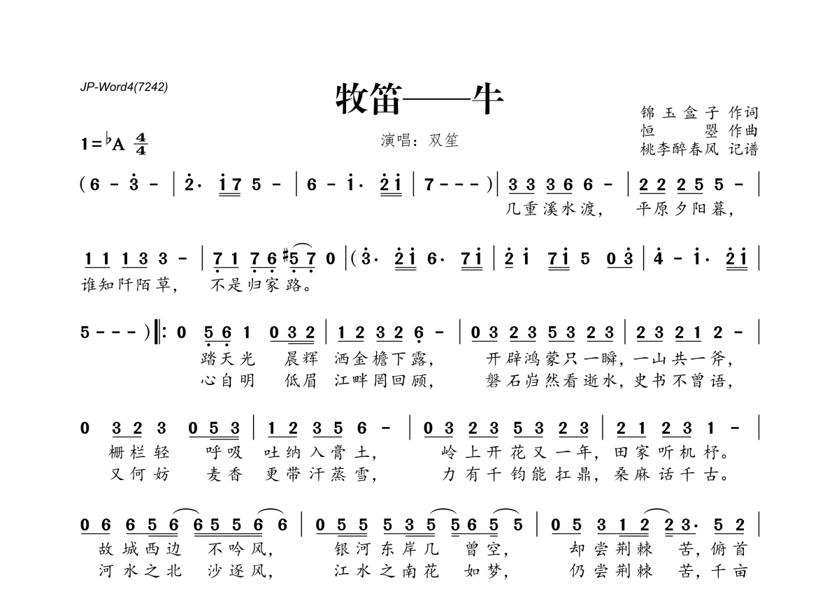 《牧笛·牛》是双笙 (陈元汐)演唱的一首歌曲,拍号为4/4拍,这份简谱共有一张高清图谱,图谱由 @桃李醉春风 编配上传。