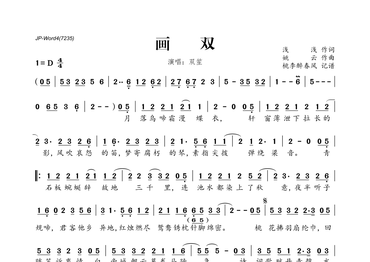 《画双》是双笙 (陈元汐)演唱的一首歌曲,拍号为4/4拍,这份简谱共有一张高清图谱,图谱由 @桃李醉春风 编配上传。