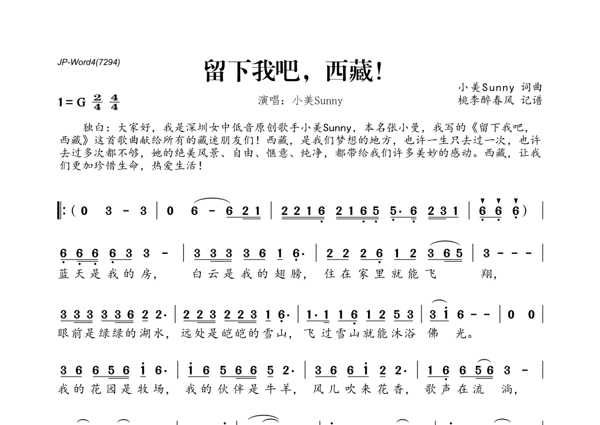 小美魅音(小美Sunny)《留下我吧,西藏!》简谱