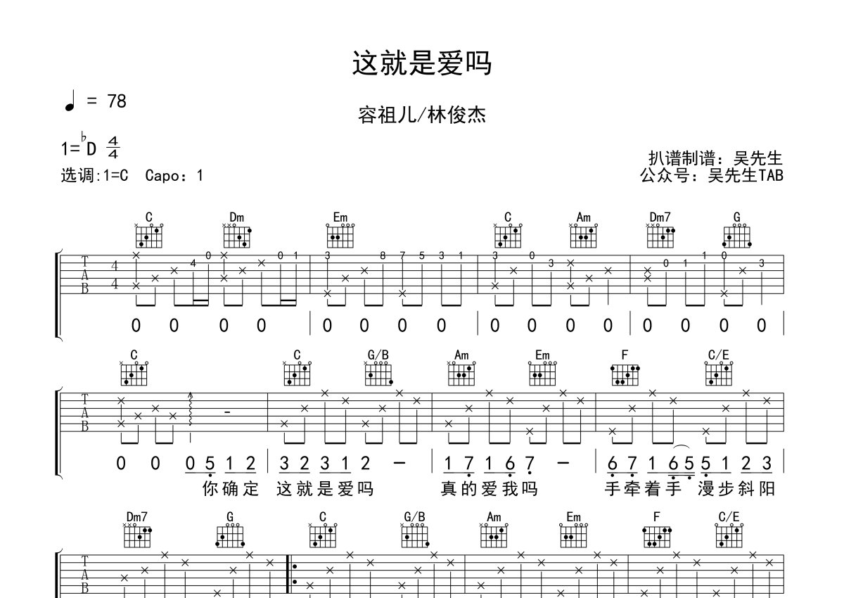 《这就是爱吗》是林俊杰/容祖儿演唱的一首歌曲,本吉他谱采用的是C调指法编配,这份吉他谱共有两张高清图谱,图谱由 @吴先生TAB 编配上传,图谱使用六线谱编配,包含吉他和弦指法、简谱以及歌词部分,使用这份这就是爱吗吉他谱,可以让你更加方便地掌握这首歌曲的弹唱技巧,快来尝试吧。原调降D调,变调夹1品。