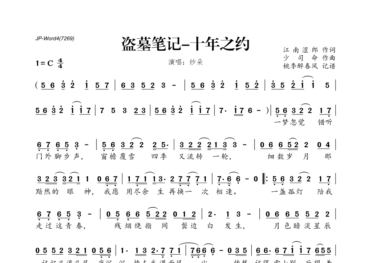 《十年之约》是纱朵演唱的一首歌曲,拍号为4/4拍,这份简谱共有一张高清图谱,图谱由 @桃李醉春风 编配上传。