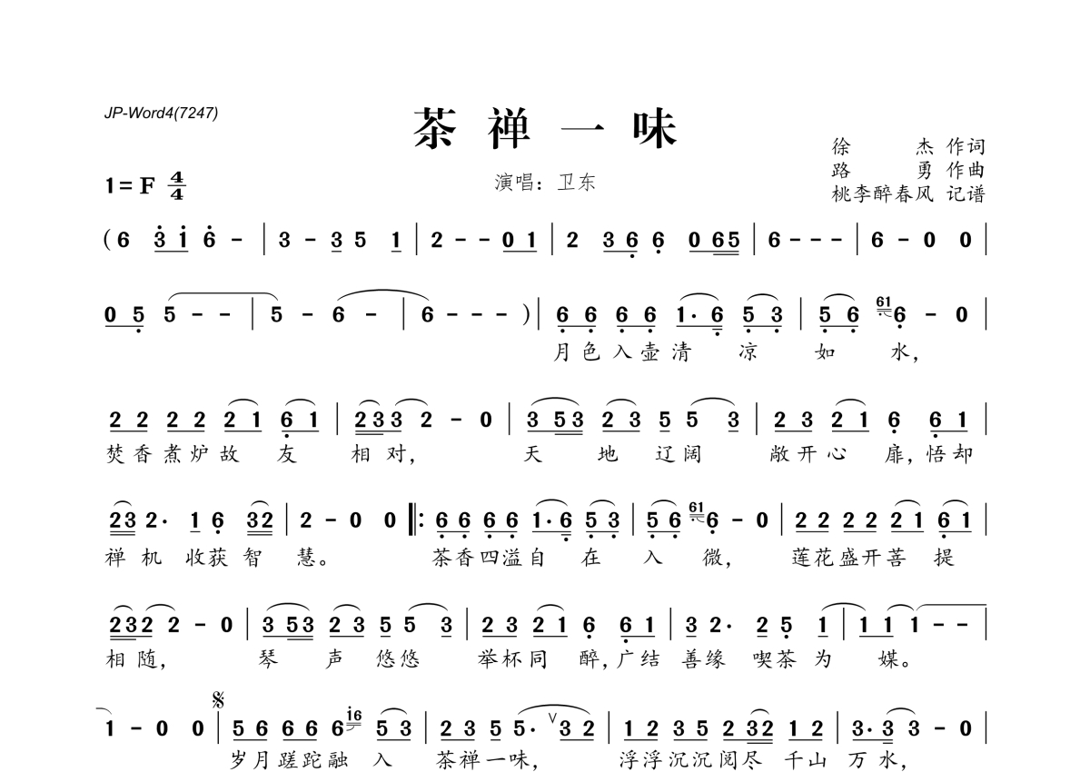 《茶禅一味》是卫东演唱的一首歌曲,拍号为4/4拍,这份简谱共有一张高清图谱,图谱由 @桃李醉春风 编配上传。