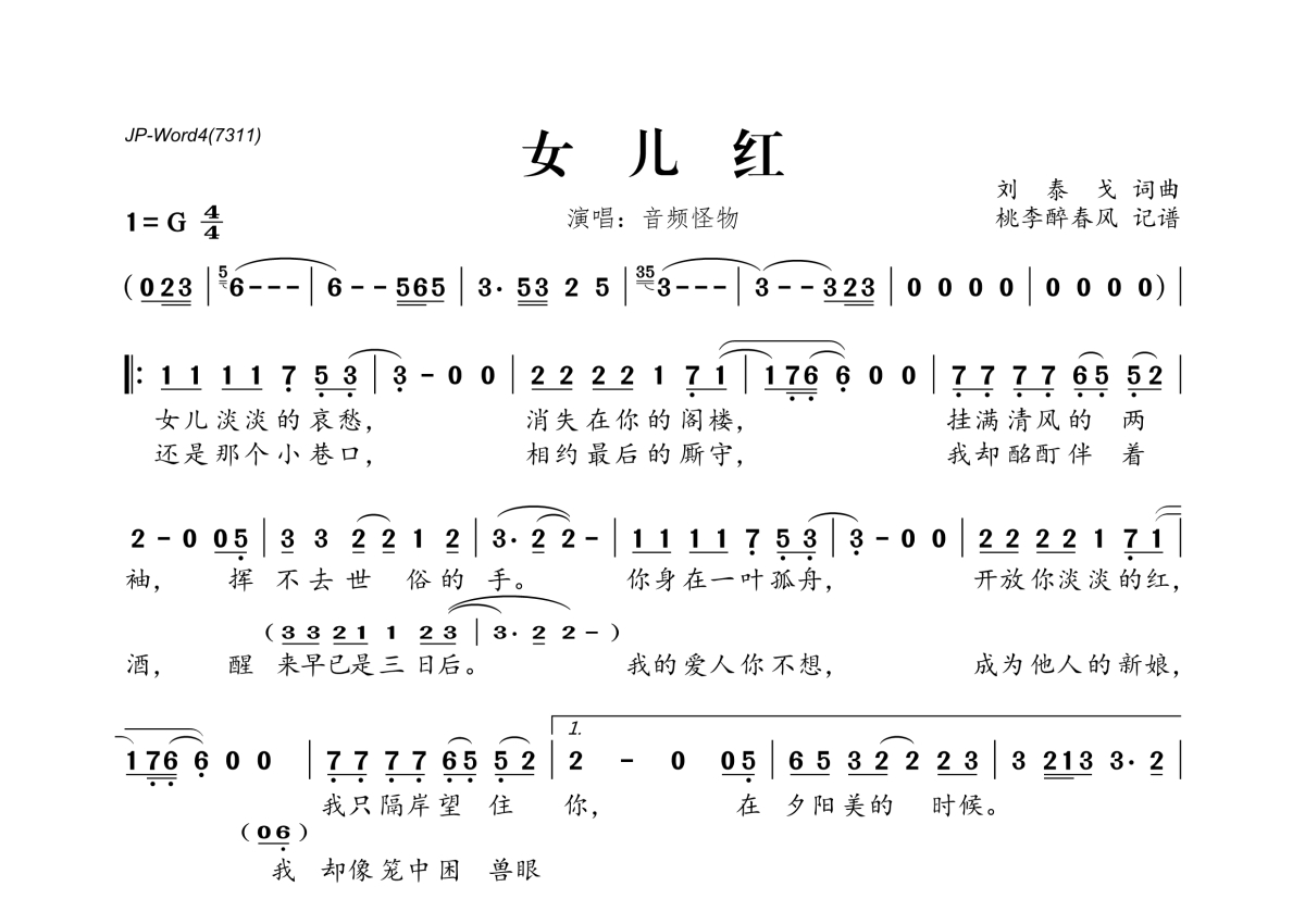 《女儿红》是音频怪物演唱的一首歌曲,拍号为4/4拍,这份简谱共有一张高清图谱,图谱由 @桃李醉春风 编配上传。