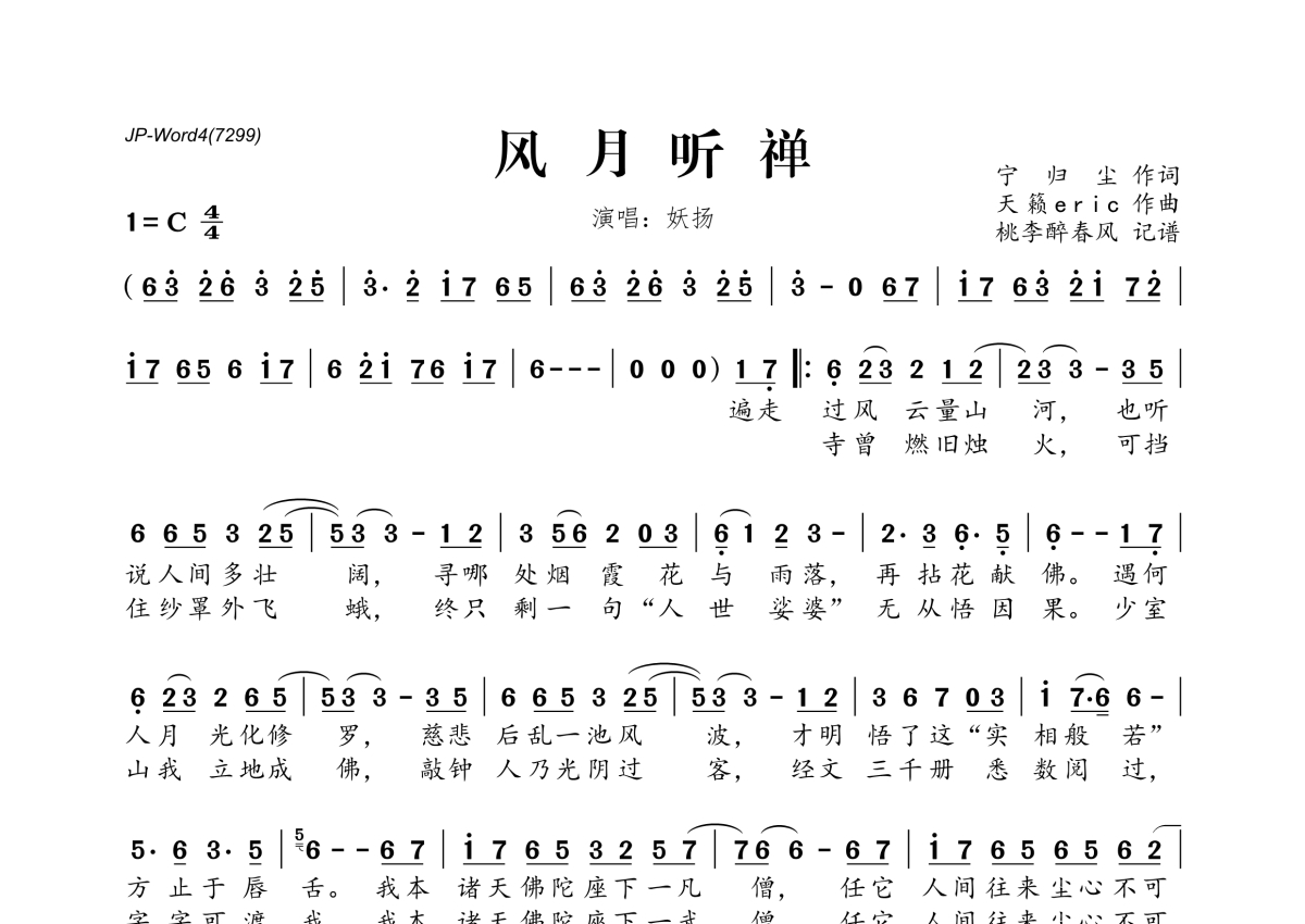 《风月听禅》是妖扬演唱的一首歌曲,拍号为4/4拍,这份简谱共有一张高清图谱,图谱由 @桃李醉春风 编配上传。