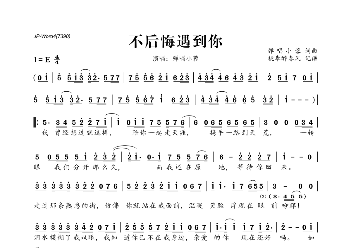 《不后悔遇到你》是弹唱小蓉演唱的一首歌曲,拍号为4/4拍,这份简谱共有一张高清图谱,图谱由 @桃李醉春风 编配上传。