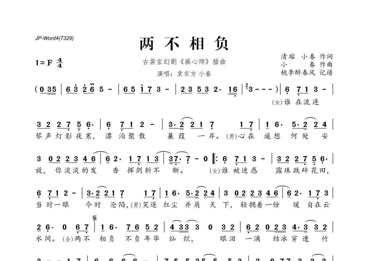 《两不相负》是小春演唱的一首歌曲,拍号为4/4拍,这份简谱共有一张高清图谱,图谱由 @桃李醉春风 编配上传。