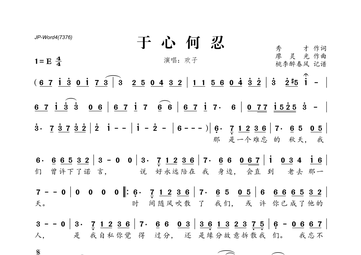 《于心何忍》是欢子演唱的一首歌曲,拍号为4/4拍,这份简谱共有一张高清图谱,图谱由 @桃李醉春风 编配上传。