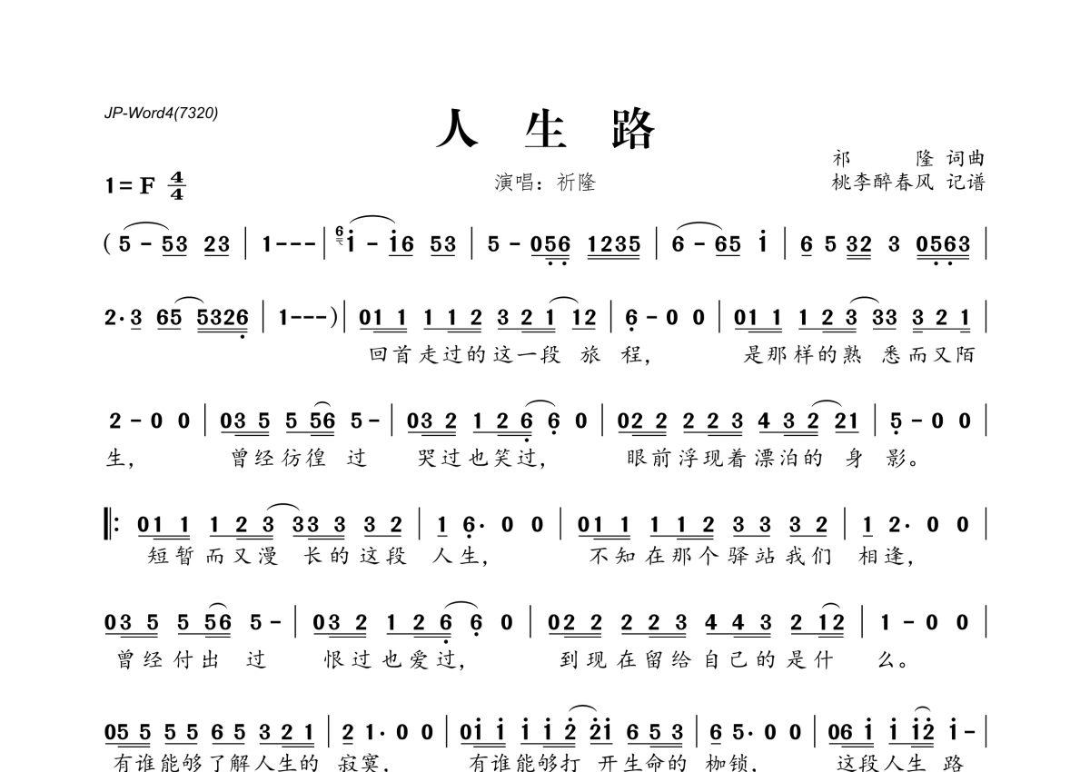 《人生路》是祁隆演唱的一首歌曲,拍号为4/4拍,这份简谱共有一张高清图谱,图谱由 @桃李醉春风 编配上传。