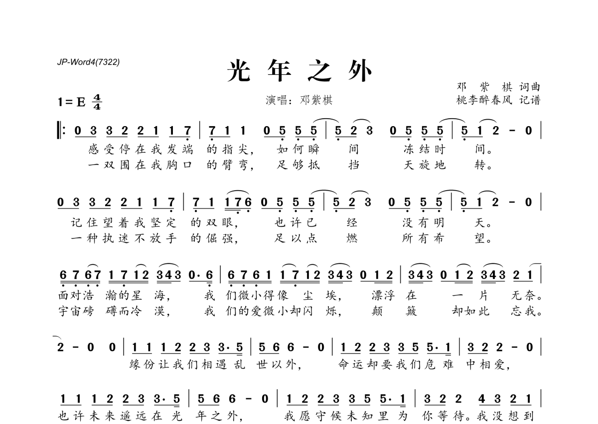 《光年之外》是G.E.M.邓紫棋演唱的一首歌曲,拍号为4/4拍,这份简谱共有一张高清图谱,图谱由 @桃李醉春风 编配上传。