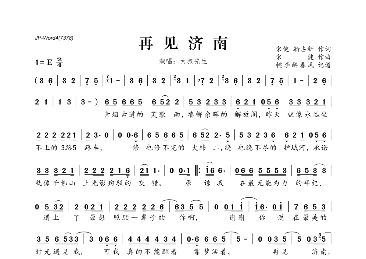 《再见济南》是大叔先生演唱的一首歌曲,拍号为2/4拍,这份简谱共有一张高清图谱,图谱由 @桃李醉春风 编配上传。
