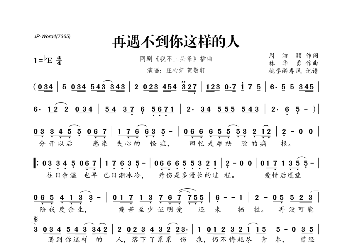 《再遇不到你这样的人》是庄心妍&贺敬轩演唱的一首歌曲,拍号为4/4拍,这份简谱共有一张高清图谱,图谱由 @桃李醉春风 编配上传。
